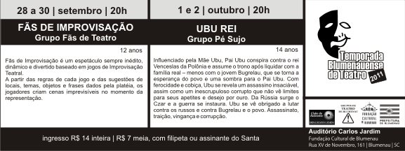 E no ano de 2011 a coordenação teve uma mudança. Depois de 02 anos seguidos, a Aline Appi saiu e deu lugar para a Ana Paula Moser Mogconan. Que assumiu a responsabilidade de coordenar a Temporada e manter o diálogo com a Fundação Cultural de Blumenau.